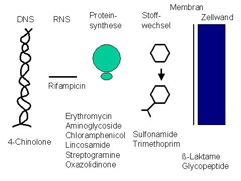 | Zellwand | Hemmung der Synthese | ß-Laktame Glycopeptide |