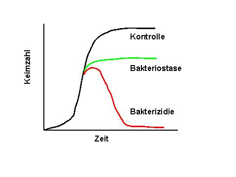 Antibiotika können im Prinzip entweder das Bakterienwachstum unterdrücken (Bakteriostase), wobei lebensfähige Keime erhalten bleiben, die sich aber in Anwesenheit des Antibiotikums nicht vermehren. Diese restlichen Bakterien müssen vom Immunsystem eliminiert werden. Daneben gibt es die Bakterizidie, bei der die Bakterien tatsächlich abgetötet werden, sich also auch nach Entfernen des Antibiotikums nicht wieder vermehren. Allerdings verbleiben auch nach Einwirkung bakterizider Antibiotika wenige Keime, die ebenfalls vom Immunsystem zu eliminieren sind. |